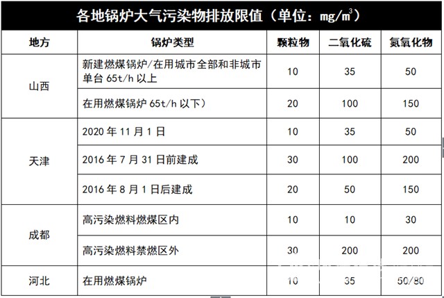 为尽快实现空气污染治理目标,各地在乐动(中国)大气污染治理上严格遵守“因地制宜”原则,很多地方的标准远远严于国家的乐动(中国)大气污染物排放标准和要求。就拿燃煤乐动(中国)看来,具体如下: